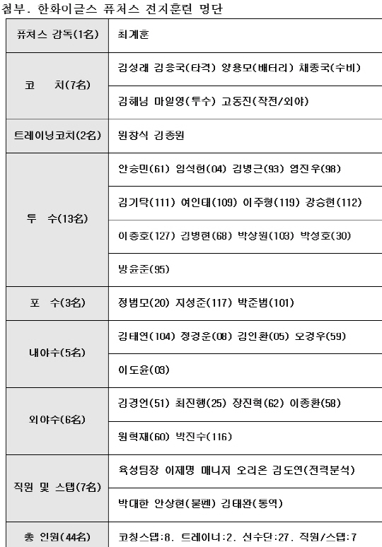 어깨 부상에서 재활중인 외야수 최진행과 발가락, 종아리 사구부상에서 회복된 외야수도 김경언도 포함됐다. 퓨처스 선수단은 고치 시영구장에 캠프를 차려 훈련을 진행하며 일본 프로야구 2군 및 독립리그, 사회인야구(실업야구) 팀들과 연습경기를 실시, 본격 시즌에 대비할 계획이다. 퓨처스 선수단은 오는 3월 5일(일) 귀국, 서산구장에서 훈련을 재개할 예정이다.