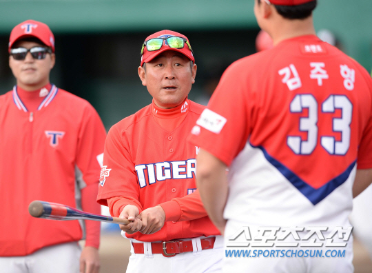 일본 오키나와에서 전지훈련 중인 KIA 타이거즈가 16일 오후 니혼햄 파이터스와 연습경기를 했다. 경기 전 김기태 감독이 김주형의 타격에 대해 조언을 하고 있다. 오키나와=정재근 기자 cjg@sportschosun.com/2017.02.16/ |