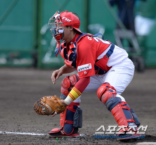 살만 빼면 다냐고 반문할 수도 있습니다. 경기에 임하는 자세도 다릅니다. 위에서 말했던 '홍구놀이'가 대표 사례입니다. 시원하게 돌리고 덕아웃에 돌아오던 그 모습이 아니었습니다. 마스크를 쓰고 앉았을 때도 변화가 있습니다. 잘 보시면 앉았을 때 두 발의 스탠스가 많이 좁혀졌습니다. 쉬어 보이지만 쉽지 않은 것이라고 합니다. 몸이 제대로 만들어질 수록 스탠스를 좁힐 수 있다고 합니다. 스탠스가 좁아지면 그만큼 다음 동작 속도를 빨리 가져갈 수 있습니다. 특히, 2루 송구를 할 때 큰 차이가 납니다. 볼배합도 과감해졌습니다. 연습경기이지만, 이전의 이홍구답지 않게 연속 3개 변화구 사인도 냅니다. 그만큼 결과에 대한 두려움이 없어졌다는 뜻입니다.