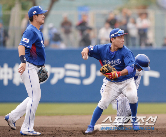 김인식 감독이 이끄는 WBC(월드베이스볼클래식) 대표팀이 22일 일본 오키나와 기노완구장에서 요코하마와 연습경기를 했다. 7회말 무사 1루 요코하마 시바타의 내야땅볼 때 2루수 서건창이 1루주자 다나카를 2루 포스아웃시키고 있다. 오키나와=정재근 기자 cjg@sportschosun.com/2017.02.22/ |