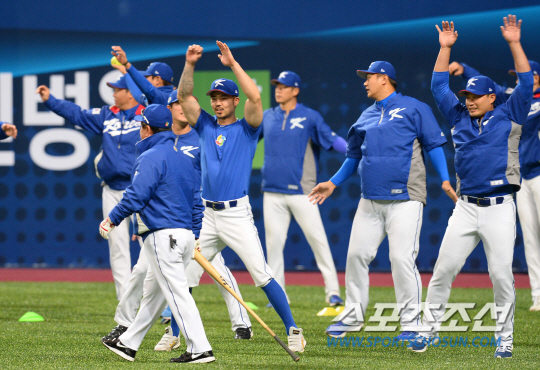 야구대표팀 오승환과 오재원이 6일 오후 2017 월드베이스볼클래식(WBC) 1라운드 이스라엘과의 경기를 앞두고 몸을 풀고 있다. 고척=최문영 기자 deer@sportschosun.com