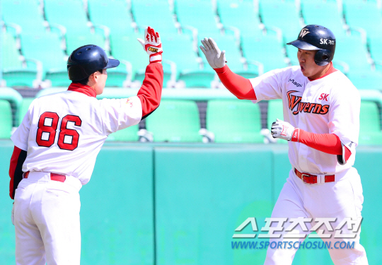 SK 와이번스 외야수 김동엽이 시즌 첫 홈런을 날렸다.