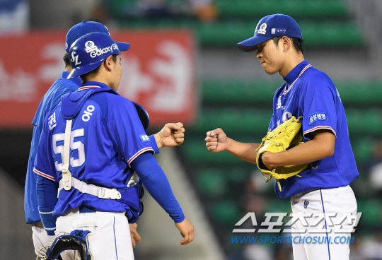 2017 KBO리그 삼성라이온즈와 두산베어스의 경기가 8일 서울 잠실야구장에서 열렸다. 삼성 선발투수 안성무가 4회말 1사 1루에서 김재호를 내야 플라이 처리한후 임현준과 교체되고 있다. 잠실=최문영 기자 deer@sportschosun.com /2017.06.08/ |