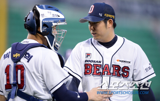 두산 베어스와 넥센 히어로즈의 2017 KBO 리그 경기가 12일 잠실구장에서 열렸다. 4회초 수비를 마친 두산 장원준-박세혁 배터리가 이야기를 나누고 있다. 잠실=허상욱 기자 wook@sportschosun.com/2017.07.12/ |