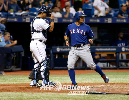 | 텍사스 레인저스 추신수가 23일(한국시각) 탬파베이 레이스와의 원정경기에서 6회초 애드리언 벨트레의 타구를 상대가 놓치는 틈을 타 득점을 올리고 있다. ⓒAFPBBNews = News1 |