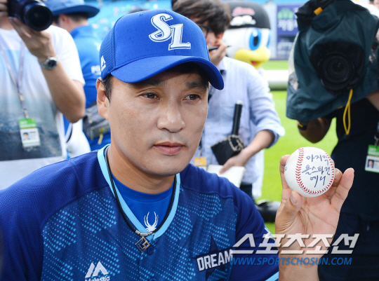 ◇지난달 KBO 올스타전에서 이승엽이 팬사인회에 참석해 야구공에 '마지막 올스타전에서'라는 문구를 새긴 후 들어보이고 있다. 정재근 기자 cjg@sportschosun.com/2017.07.15/