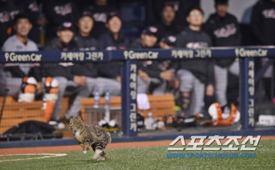 17일 오후 서울 잠실야구장에서 2018 KBO리그 한화와 두산의 경기가 열렸다. 9회말 그라운드에 난입한 고양이로 인해 경기가 중단되고 있다.