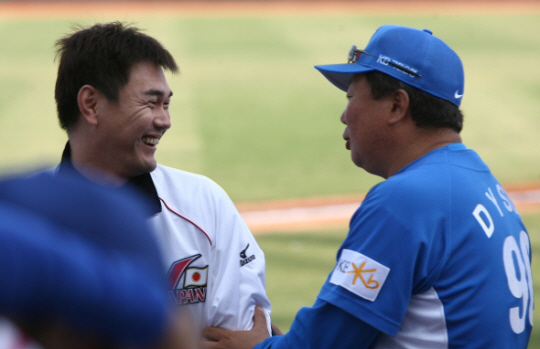올해 일본 프로야구 최고령 선수는 주니치 드래곤즈 이와세 히토키다. 지난 2007년 12월 베이징올림픽 예선전이 열린 대만 타이중에서 일본 대표팀의 이와세가 한국 대표팀 선동열 코치를 만나 반갑게 인사하고 있다. 선동열과 이와세는 99년 주니치에서 한솥밥을 먹었다. 스포츠조선 DB