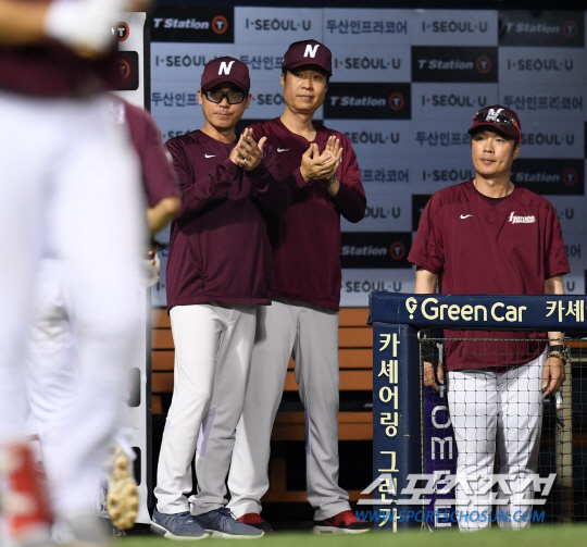 | 두산 베어스와 넥센 히어로즈의 2018 KBO 리그 경기가 20일 잠실구장에서 열렸다. 7회초 2사 1루 넥센 박병호가 우중간 담장을 넘어가는 2점홈런을 날렸다. 박병호에게 박수를 보내는 장정석 감독과 허문회 코치의 모습. 잠실=허상욱 기자 wook@sportschosun.com/2018.06.20/ |