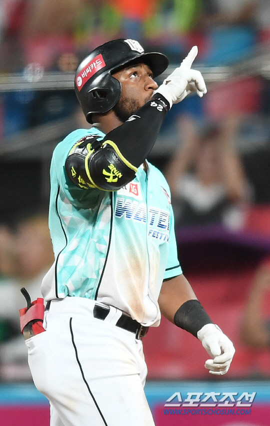 2018 KBO리그 LG 트윈스와 kt위즈의 경기가 29일 수원 kt위즈파크에서 열렸다. 8회말 1사 1, 2루 kt 로하스가 1타점 안타를 치고 나가 기뻐하고 있다. 수원=정재근 기자 cjg@sportschosun.com/2018.07.29/