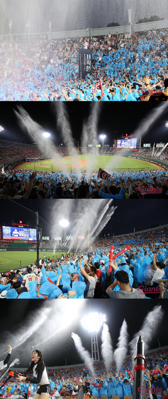 롯데는 1루 응원석 일대와 외야 응원단상석을 워터존으로 정해 경기 중 안타, 득점, 홈런 등 주요상황 때마다 물대포를 발사했다. 내야 및 외야 응원석에 14대의 워터캐논을 설치하고 2대의 리프트와 살수차를 마련해 20톤의 물을 뿌렸고, 응원단장을 비롯한 치어리더들도 시원한 스페셜 스테이지를 선보였다.