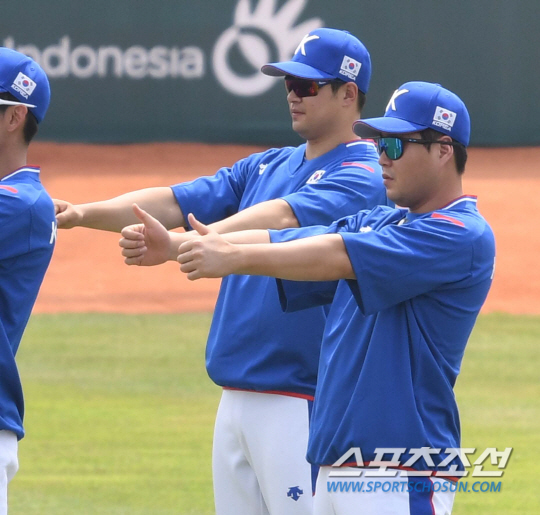 24일 오후 인도네시아 라와망운 스포츠 콤플렉스에서 '2018 카르타-팔렘방아시안게임' 한국 야구대표팀의 훈련이 열렸다. 한국 양의지와 김재환이 몸을 풀고 있다. 자카르타(인도네시아)=김경민 기자 kyungmin@sportschosun.com /2018.08.24/