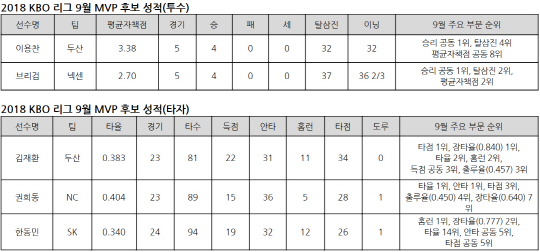 KBO는 2일 KBO리그 9월 MVP 후보를 확정했다.