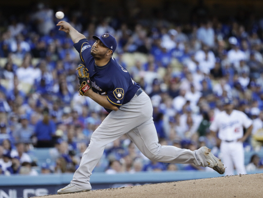 | 밀워키 브루어스 줄리스 샤신이 16일(한국시각) 다저스타디움에서 열린 LA 다저스와의 내셔널리그 챔피언십시리즈 3차전에 선발등판해 힘차게 공을 뿌리고 있다. LA=AP연합뉴스 |