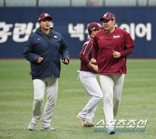2018 KBO리그 포스트시즌 플레이오프 4차전 SK와이번즈와 넥센히어로즈의 경기가 31일 서울 고척스카이돔에서 열릴 예정이다. 경기전, 넥센 이보근과 오주원이이 준비운동을 하고 있다. 고척=최문영 기자 deer@sportschosun.com /2018.10.31/ |