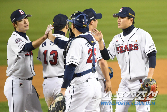 2018 KBO리그 한국시리즈 2차전 SK와이번즈와 두산베어스의 경기가 5일 서울 잠실야구장에서 열렸다.두산 선수들이 팀의 7대3 승리를 확정짓고 환호하고 있다. 잠실=최문영 기자 deer@sportschosun.com /2018.11.05/ |