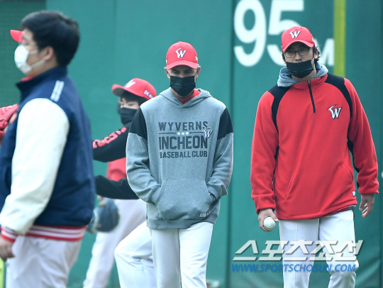 7일 오후 인천 SK행복드림구장에서 KBO리그 한국시리즈(KS) 3차전 SK 와이번스와 두산 베어스의 경기가 열린다. 경기 전 SK 선수들이 훈련에 임하고 있다. 선수들의 훈련을 지켜보고 있는 힐만 감독. 인천=송정헌 기자 songs@sportschosun.com
