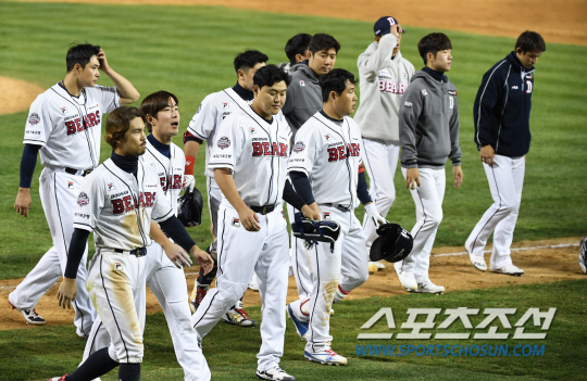 2018 KBO리그 한국시리즈 1차전 SK와의 두산의 경기가 4일 오후 서울 잠실야구장에서 열렸다. 3대7로 패배한 두산 선수들이 덕아웃으로 향하고 있다. 잠실=김경민 기자 kyungmin@sportschosun.com /2018.11.04/ |