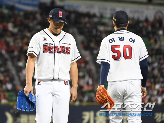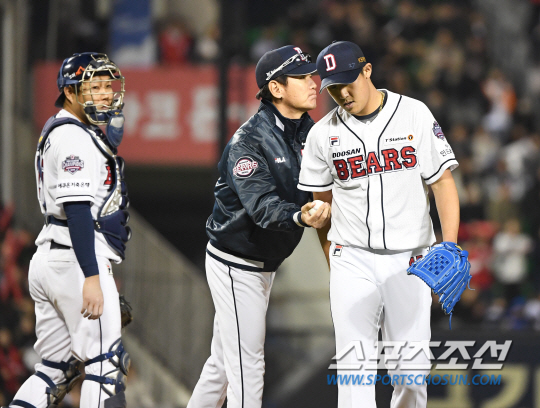 | 12일 오후 서울 잠실야구장에서 KBO리그 한국시리즈(KS) 6차전 두산 베어스와 SK 와이번스의 경기가 열렸다. 두산 선발 이용찬이 2회 무사 2루에서 마운드를 이영하에게 넘겼다. 아쉬운 표정으로 마운드를 내려오고 있는 이용찬. 잠실=송정헌 기자 songs@sportschosun.com/2018.11.12/ |