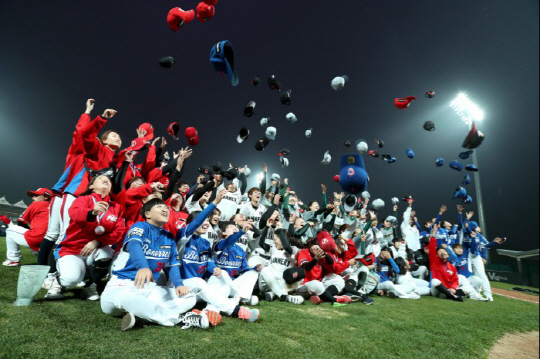 | 2018년 LG배 한국여자야구대회가 11일 폐막했다. 11일 경기도 이천 'LG 챔피언스파크'에서 열린 폐막식에서 선수들이 모자를 던지며 환호하고 있다. 사진제공=LG전자 |