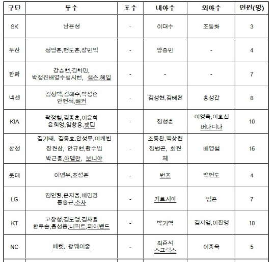 제외 명단에서는 봉중근 정성훈 조동화 등 은퇴를 선언한 선수들과, 재계약이 불발된 외국인 선수들 그리고 김태완 박헌도 등의 선수들이 포함돼 눈길을 끌었다.