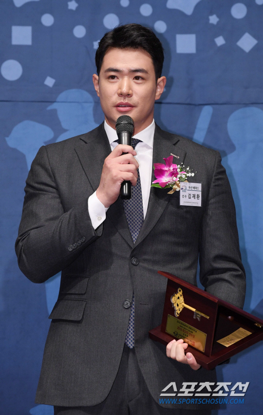 김재환은 단상에 올라 "영광스러운 상을 주셔서 너무 감사드린다. 앞으로도 조금 더 겸손하게 최선을 다할 수 있는 선수가 되겠다"고 소감을 밝혔다. 이어 "목표는 하나밖에 없다. 내년 시즌에도 우승을 위해 노력하겠다"고 덧붙였다.