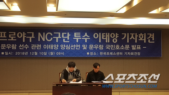 이태양은 NC 구단에도 억울함을 호소했다. 이태양은 "구단에서 도와준다고 약속하며 자수를 권유했다. 군대에 다녀오면 구단에서 다시 받아주겠다고 약속했다. 하지만 구단은 언론과의 접촉을 막고 나에 대한 악의적인 인터뷰를 했다. 구단이 지정해준 변호사는 문우람 무죄에 대한 얘기를 하면 나와 우람이가 불리해지는 상황만 만들었다"고 했다. NC 구단은 이태양의 전화번호가 바뀌었다며 연락이 되지 않는다고 했지만, 이태양은 오랜 기간 전화번호를 바꾼 적이 없다고 밝혔다.