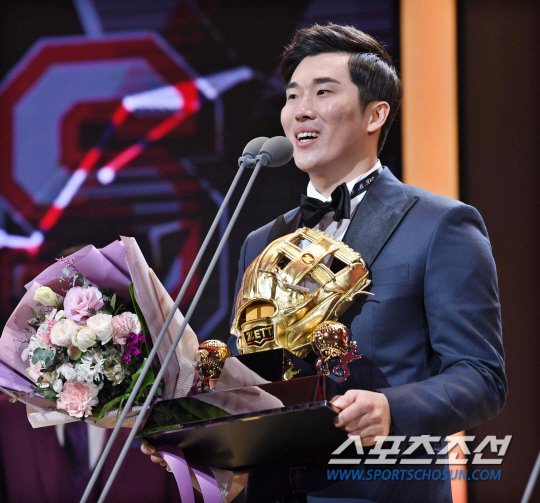 2018 프로야구 포지션별 최고의 영예의 선수를 뽑는 골든글러브 시상식이 10일 코엑스 오디토리움에서 열렸다. 시상식에서 3루수 부문상을 받은 두산 허경민이 수상소감을 밝히고 있다. 김경민 기자 kyungmin@sportschosun.com /2018.12.10/ |