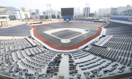 공정률 90%를 넘긴 창원NC파크의 목표 준공일은 오는 2월 28일. 그라운드에 잔디가 모두 깔렸고, 경기장 좌석 역시 대부분 설치가 완료됐다. 내부 마감 공사 및 점검만 남겨두고 있다.