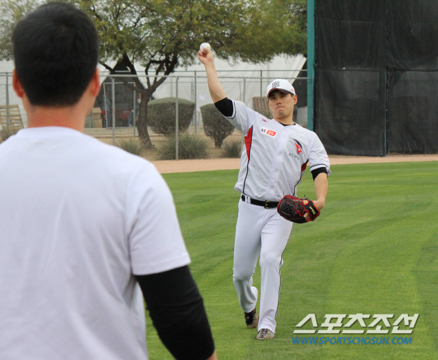 KT 위즈의 스프링캠프가 10일(한국시각) 미국 애리조나주 투산의 키노스포츠컴플렉스에서 계속됐다. KT 마무리 김재윤이 콜로라도 로키스의 오승환과 캐치볼을 하고 있다.