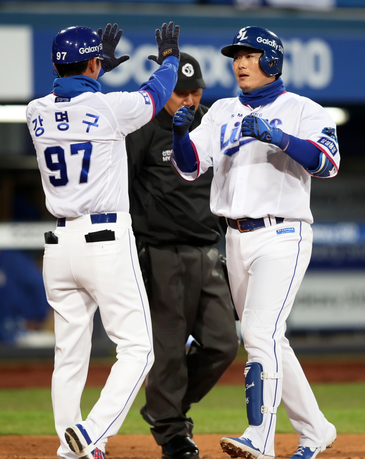 3일 대구 삼성라이온즈파크에서 열린 KIA 타이거즈와의 경기에서 삼성 이원석이 2회 말 2사 1루 때 투런 홈런을 터뜨리고 홈에서 강명구 코치의 환영을 받고 있다. 사진제공=삼성 라이온즈