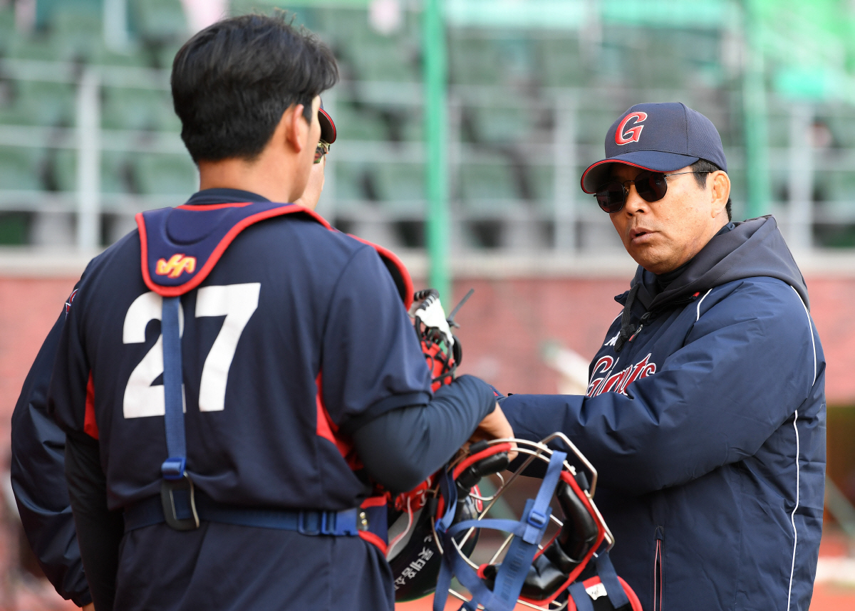2019 KBO리그 롯데 자이언츠와 SK 와이번스의 경기가 4일 오후 인천 SK 행복드림구장에서 열린다. 롯데 양상문 감독이 훈련중이던 나종덕 포수와 이야기를 나누고 있다. 인천=정재근 기자 cjg@sportschosun.com