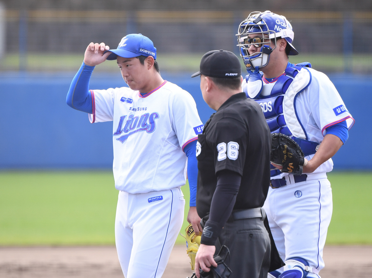 25일 일본 오키나와 온나손 아카마구장에서 삼성 라이온즈와 한화 이글스의 연습경기가 열렸다. 선발로 마운드에 오른 삼성 양창섭이 팔꿈치 통증을 호소하며 1회 2사에서 마운드를 자진 강판하고 있다. 오키나와(일본)=송정헌 기자 songs@sportschosun.com/2019.02.25/