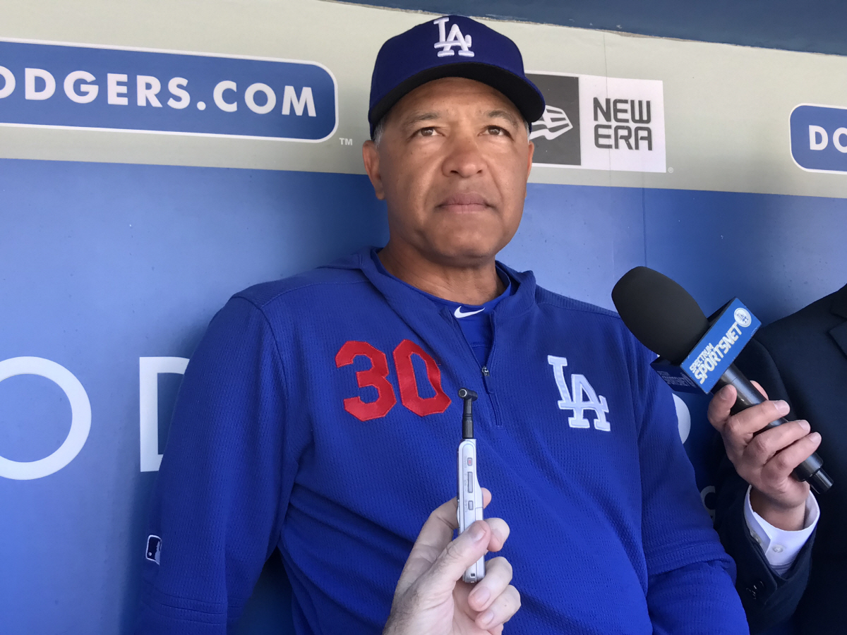 LA 다저스 데이브 로버츠 감독이 14일(한국시각) 밀워키 브루어스와의 홈게임을 앞두고 취재진과 인터뷰를 하고 있다. LA=한만성 통신원