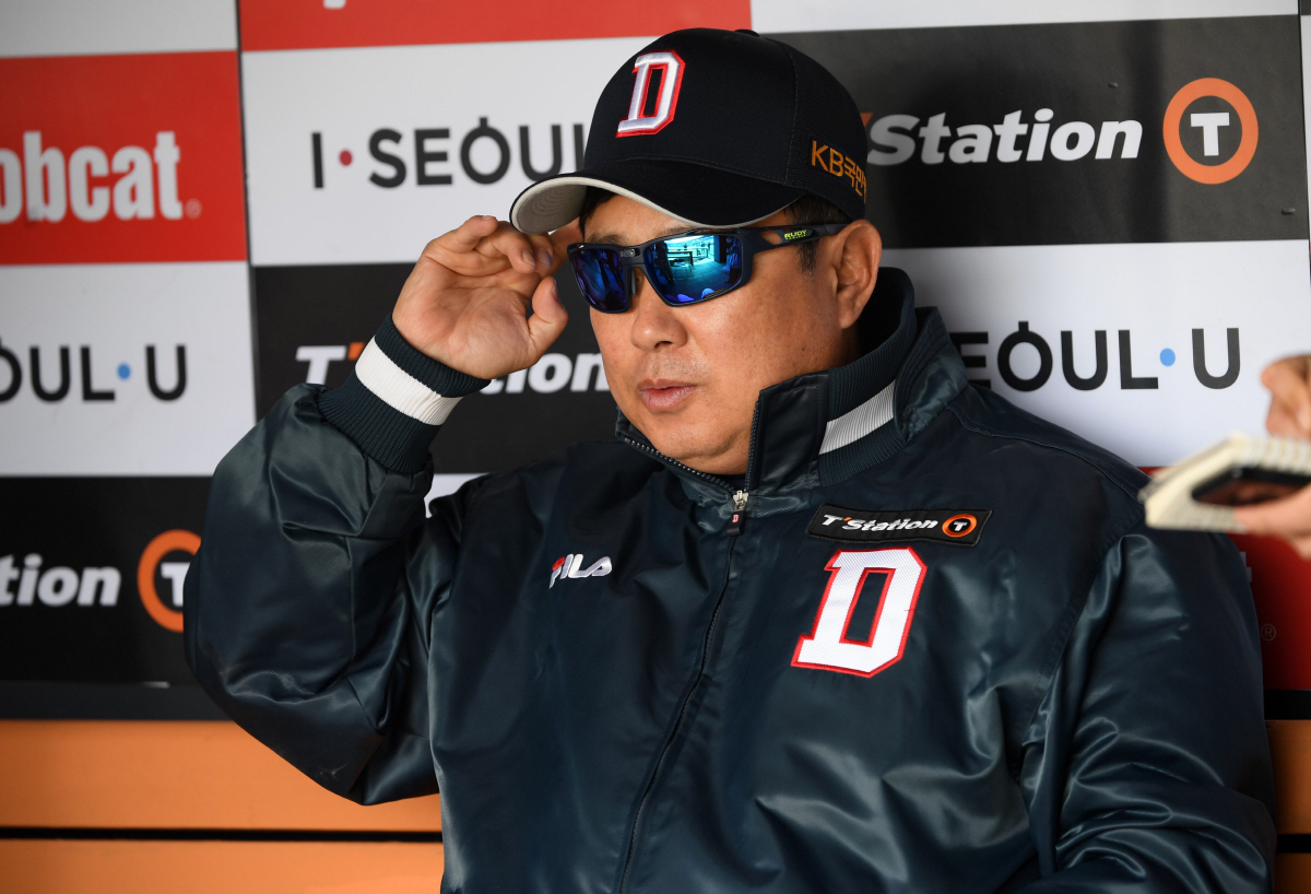 두산 베어스와 NC 다이노스의 2019 KBO리그 경기가 7일 잠실구장에서 예정된 가운데 양팀 선수단이 훈련을 펼쳤다. 두산 김태형 감독이 취재진과 이야기를 나누고 있다. 잠실=허상욱 기자 wook@sportschosun.com