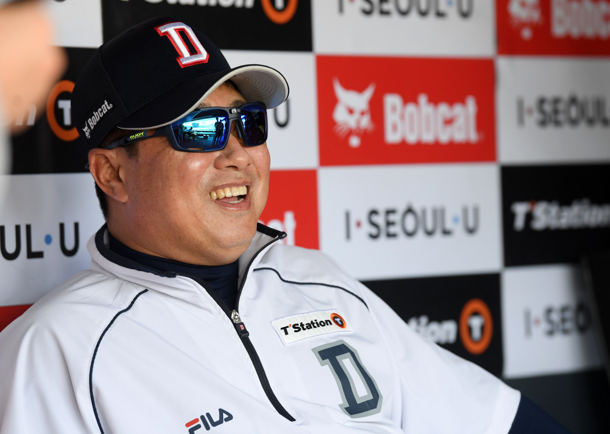 두산 베어스와 SK 와이번스의 2019 KBO 리그 경기가 17일 잠실구장에서 예정된 가운데 양팀 선수단이 훈련을 펼쳤다. 두산 김태형 감독이 취재진과 이야기를 나누고 있다. 잠실=허상욱 기자 wook@sportschosun.com/2019.04.17/