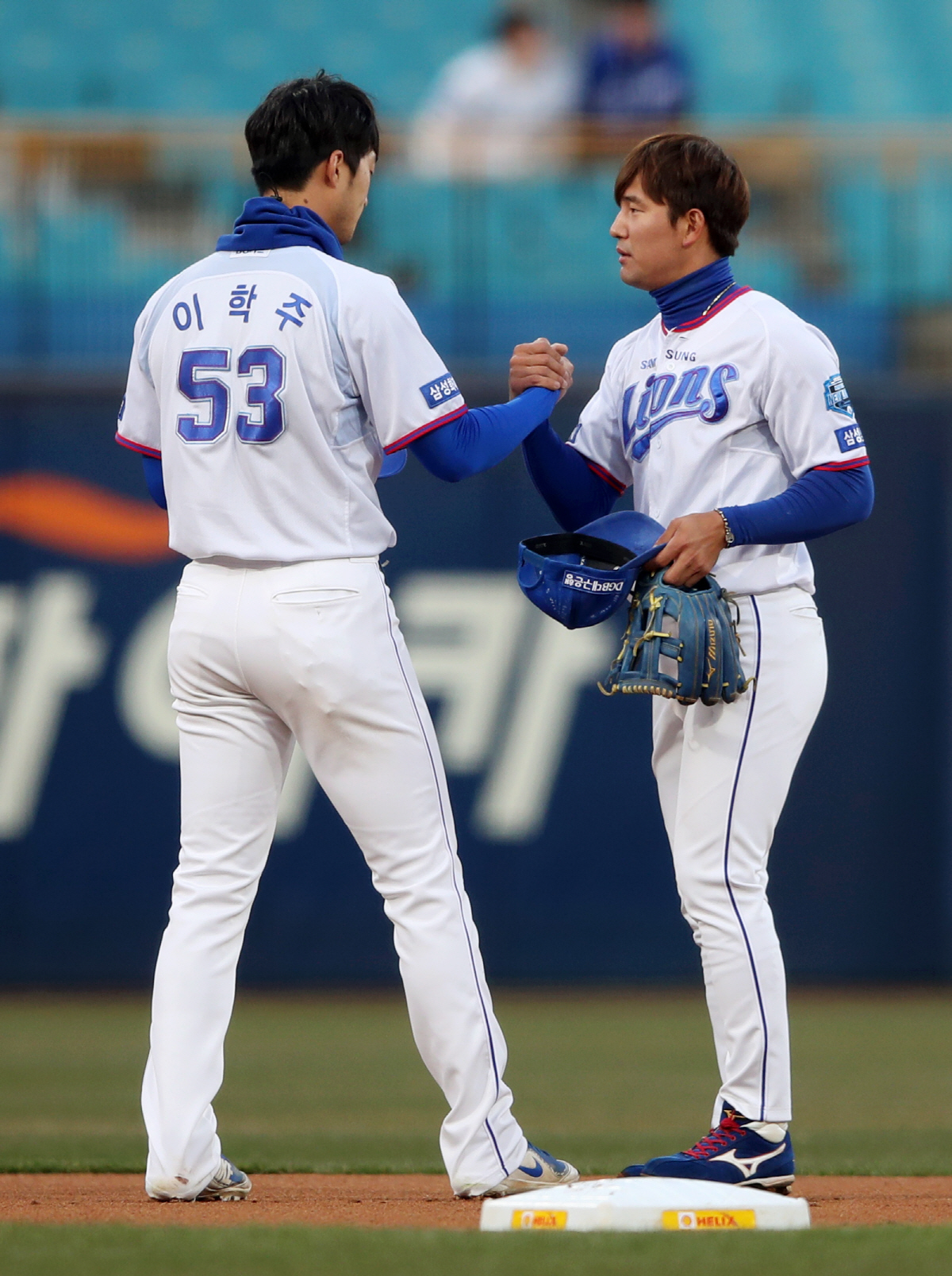 동갑내기 동기생 이학주와 김상수는 삼성 내야를 이끄는 새로운 키스톤 플레이어다. 4일 오후 대구 삼성라이온즈파크에서 열린 2019 신한은행 MY CAR KBO리그 삼성 라이온즈와 KIA 타이거즈의 경기에서 삼성 김상수와 이학주가 1회초 수비에 앞서 승리의 결의를 다지고 있다. 사진제공=삼성라이온즈