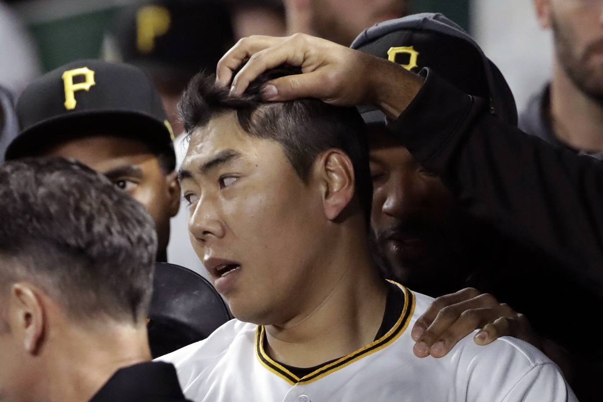 ◇축하받는 강정호. Pittsburgh Pirates' Jung Ho Kang, center, celebrates in the dugout after hitting a solo home run off Arizona Diamondbacks starting pitcher Merrill Kelly in the sixth inning of a baseball game in Pittsburgh, Wednesday, April 24, 2019. (AP Photo/Gene J. Puskar) <저작권자(c) 연합뉴스, 무단 전재-재배포 금지>