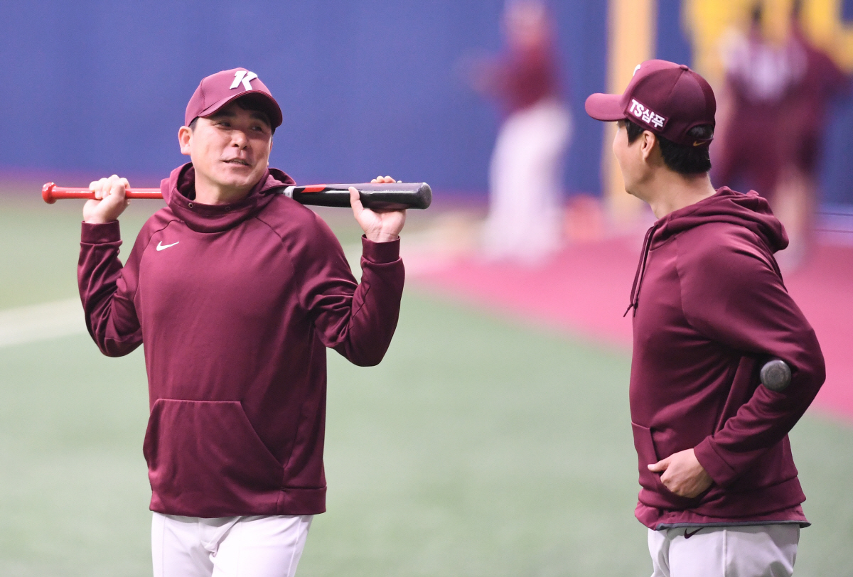 28일 서울 고척스카이돔에서 KBO리그 키움 히어로즈와 KIA 타이거즈의 경기가 열린다. 경기 전 키움 선수들이 훈련에 임하고 있다. 허문회 수석코치와 대화를 나누고 있는 장정석 감독. 고척=송정헌 기자 songs@sportschosun.com/2019.04.28/