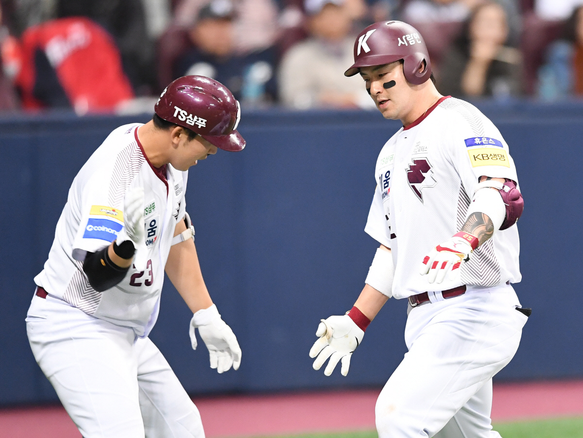 28일 서울 고척스카이돔에서 KBO리그 키움 히어로즈와 KIA 타이거즈의 경기가 열렸다. 4회 키움 박병호가 KIA 홍건희를 상대로 시즌 6호 솔로홈런을 날렸다. 장영석과 하이파이브를 나누고 있는 박병호. 고척=송정헌 기자 songs@sportschosun.com