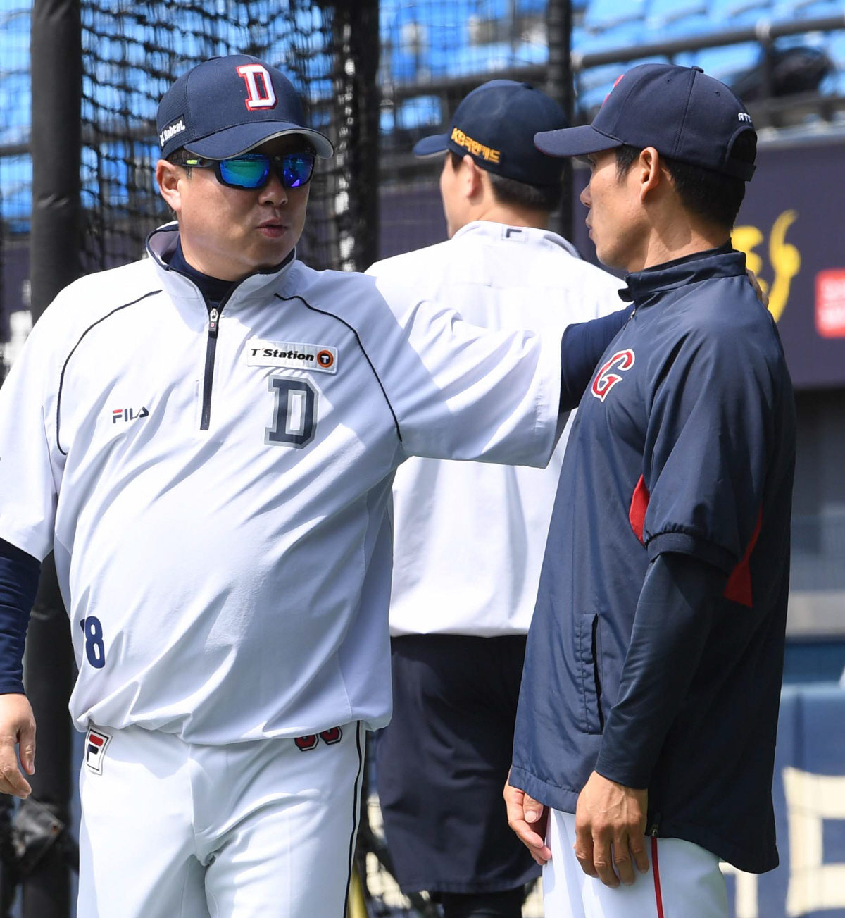 ◇이때만 해도 좋았는데. 2019 KBO 리그 두산베어스와 롯데자이언츠의 경기가 28일 서울잠실야구장에서 열릴 예정이다. 경기전, 롯데 최만호 코치와 두산 김태형 감독이 이야기를 나누고 있다. 잠실=최문영 기자 deer@sportschosun.com /2019.04.28/