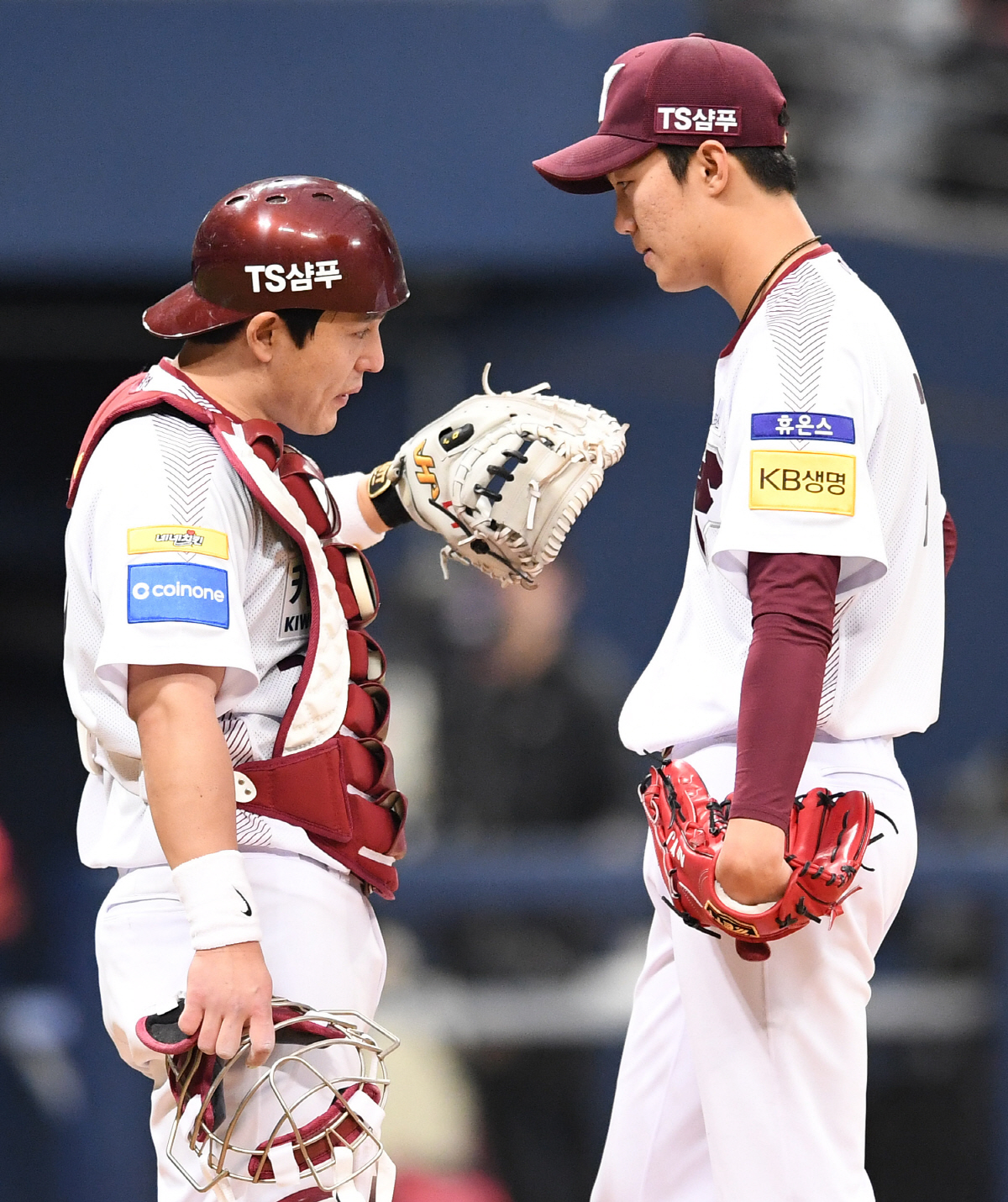 28일 서울 고척스카이돔에서 KBO리그 키움 히어로즈와 KIA 타이거즈의 경기가 열렸다. 3회 2사 1, 3루 실점 위기에서 키움 박동원 포수가 마운드에 올라 안우진과 대화를 나누고 있다. 고척=송정헌 기자 songs@sportschosun.com/2019.04.28/