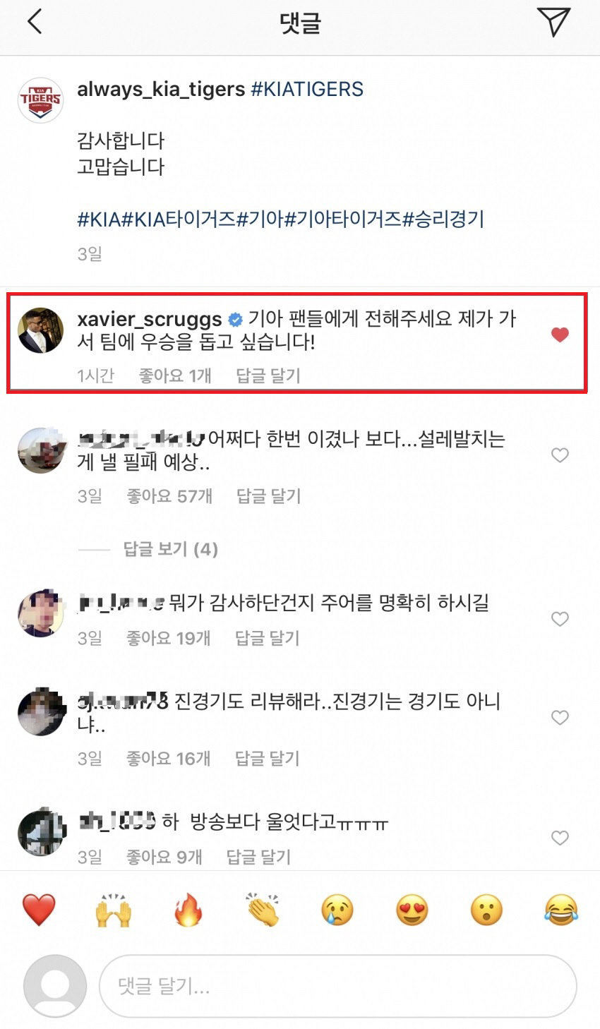스크럭스가 틈새를 노리는 팀은 KIA 타이거즈다. 11일 KIA 구단이 운영 중인 SNS에 팔로우를 신청한 스크럭스는 30일 직접 답글까지 달았다. 9연패에서 탈출한 글에 번역기를 이용해 '기아 팬들에게 전해주세요. 제가 가서 팀에 우승을 돕고 싶습니다!'라는 글을 게재했다.