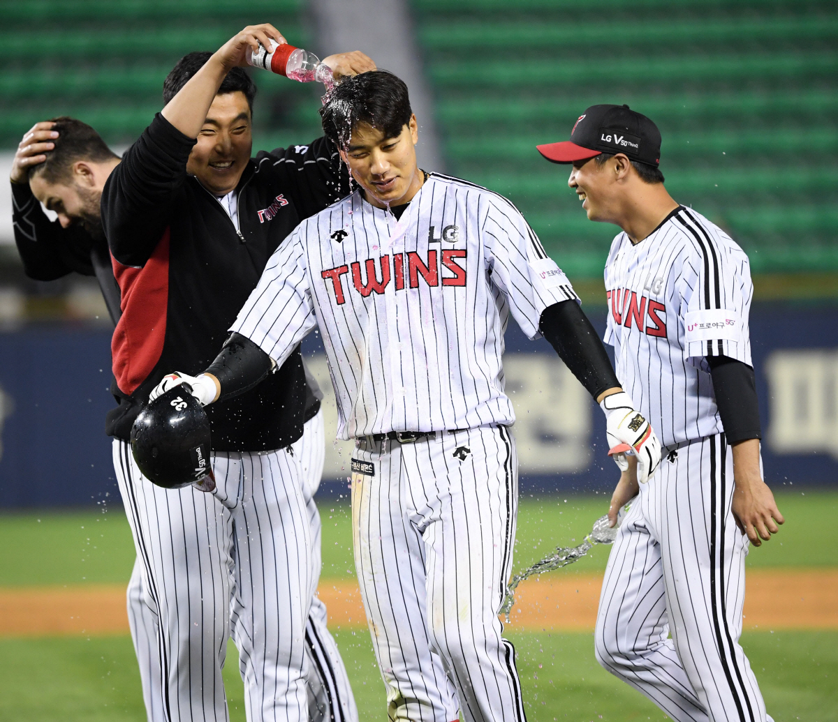 LG 트윈스와 kt 위즈의 2019 KBO 리그 주중 3연전 첫번째 경기가 30일 잠실구장에서 열렸다. 연장 11회말 LG가 이천웅의 끝내기 밀어내기 볼넷으로 10대9로 승리했다. 승리의 기쁨을 나누는 이천웅의 모습. 잠실=허상욱 기자 wook@sportschosun.com/2019.04.30/