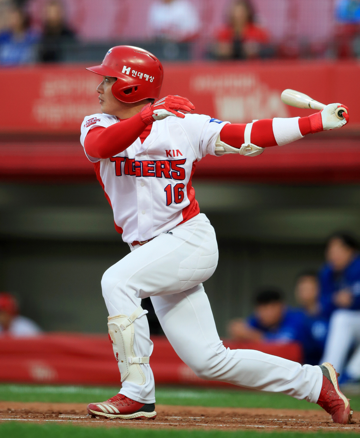 2일 광주 기아챔피언스필드에서 열린 삼성과의 2019시즌 KBO리그 홈 경기에서 KIA 캡틴 김주찬이 개인통산 1800안타를 때려내고 있다. 사진제공=KIA 타이거즈
