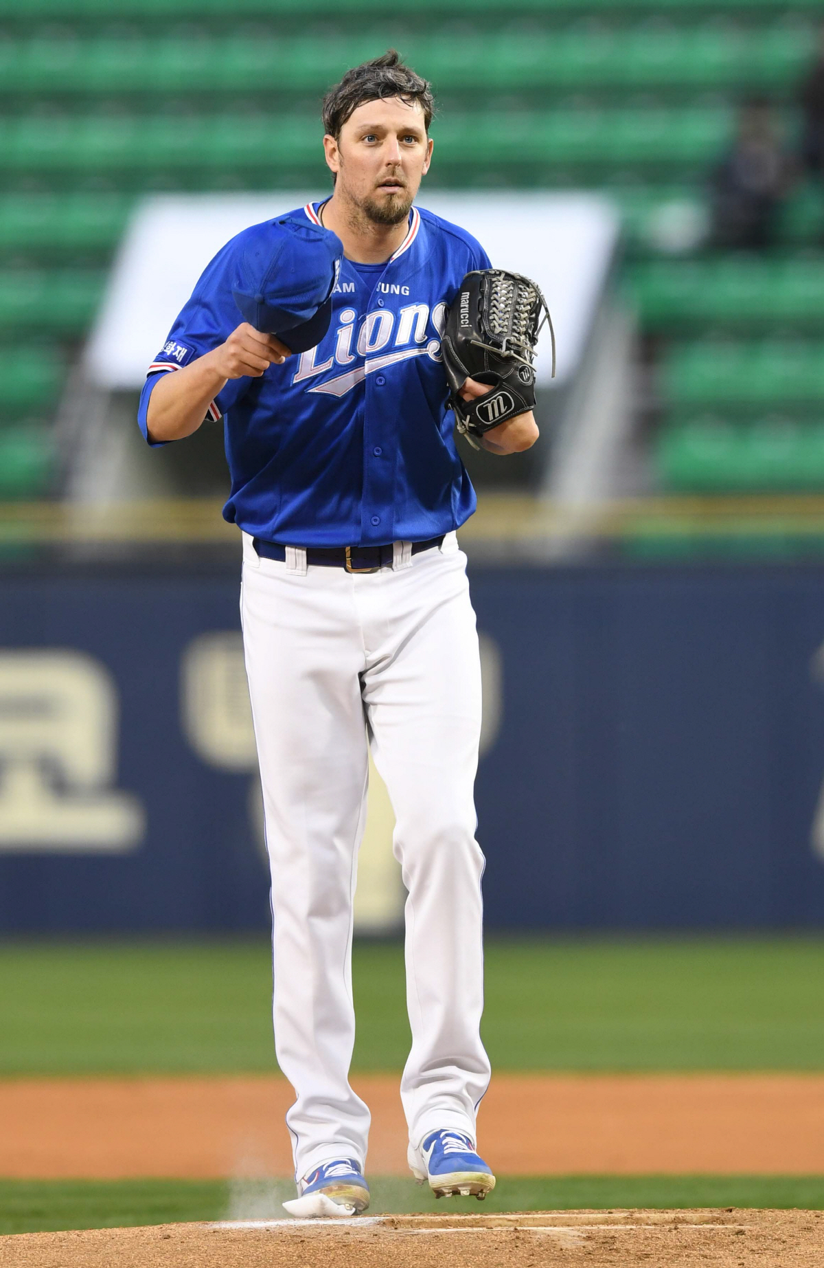 2019 KBO 리그 LG트윈스와 삼성라이온즈의 경기가 10일 서울잠실야구장에서 열렸다. 삼성 선발투수 맥과이어가 마운드에 들어서 이영재 주심에게 인사를 건네고 있다. 잠실=최문영 기자 deer@sportschosun.com /2019.04.10/