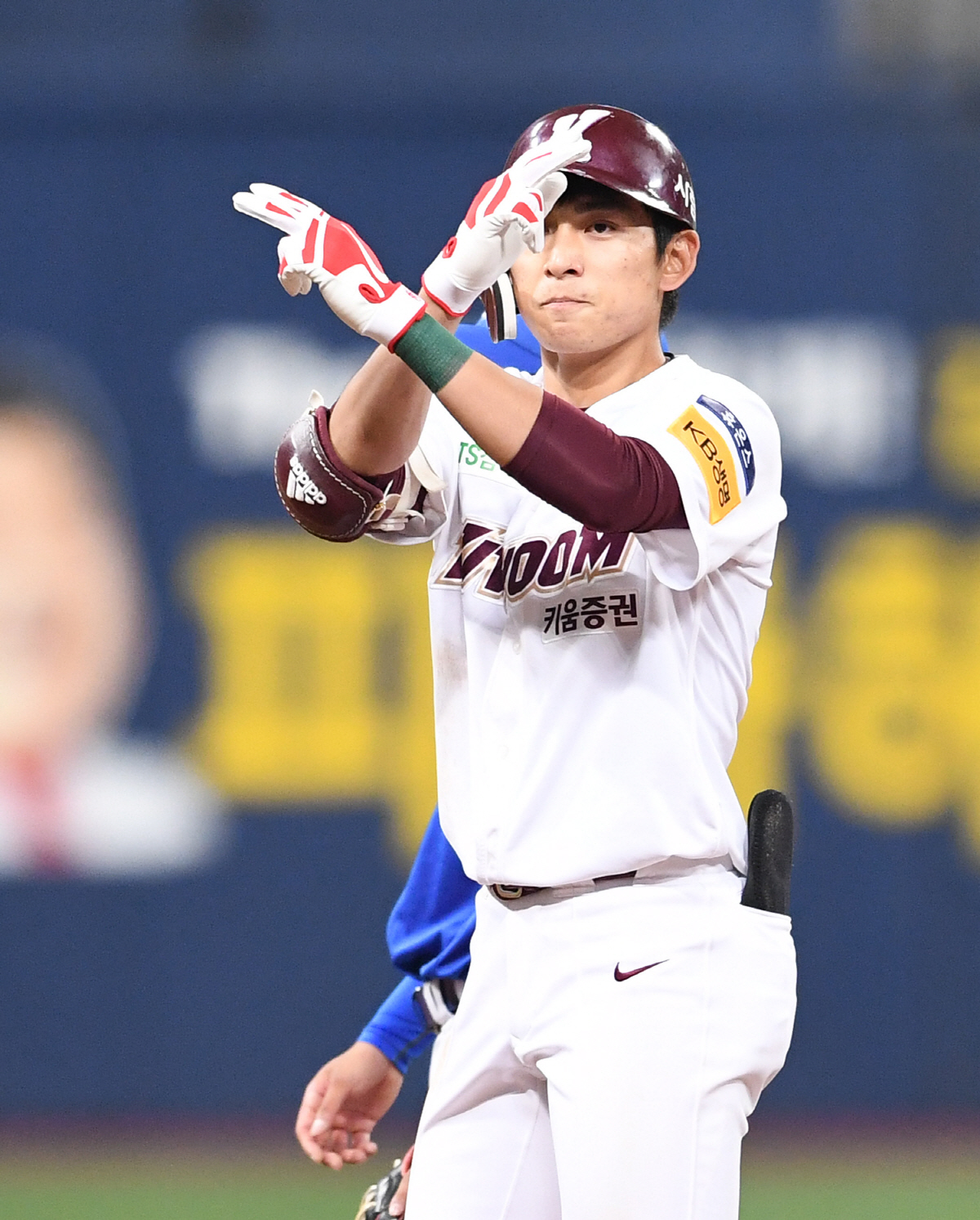 3일 서울 고척스카이돔에서 KBO리그 키움 히어로즈와 삼성 라이온즈의 경기가 열렸다. 2회 키움 이정후가 동점 2타점 2루타를 날렸다. 2루에서 손을 들어보이고 있는 이정후. 고척=송정헌 기자 songs@sportschosun.com/2019.05.03/