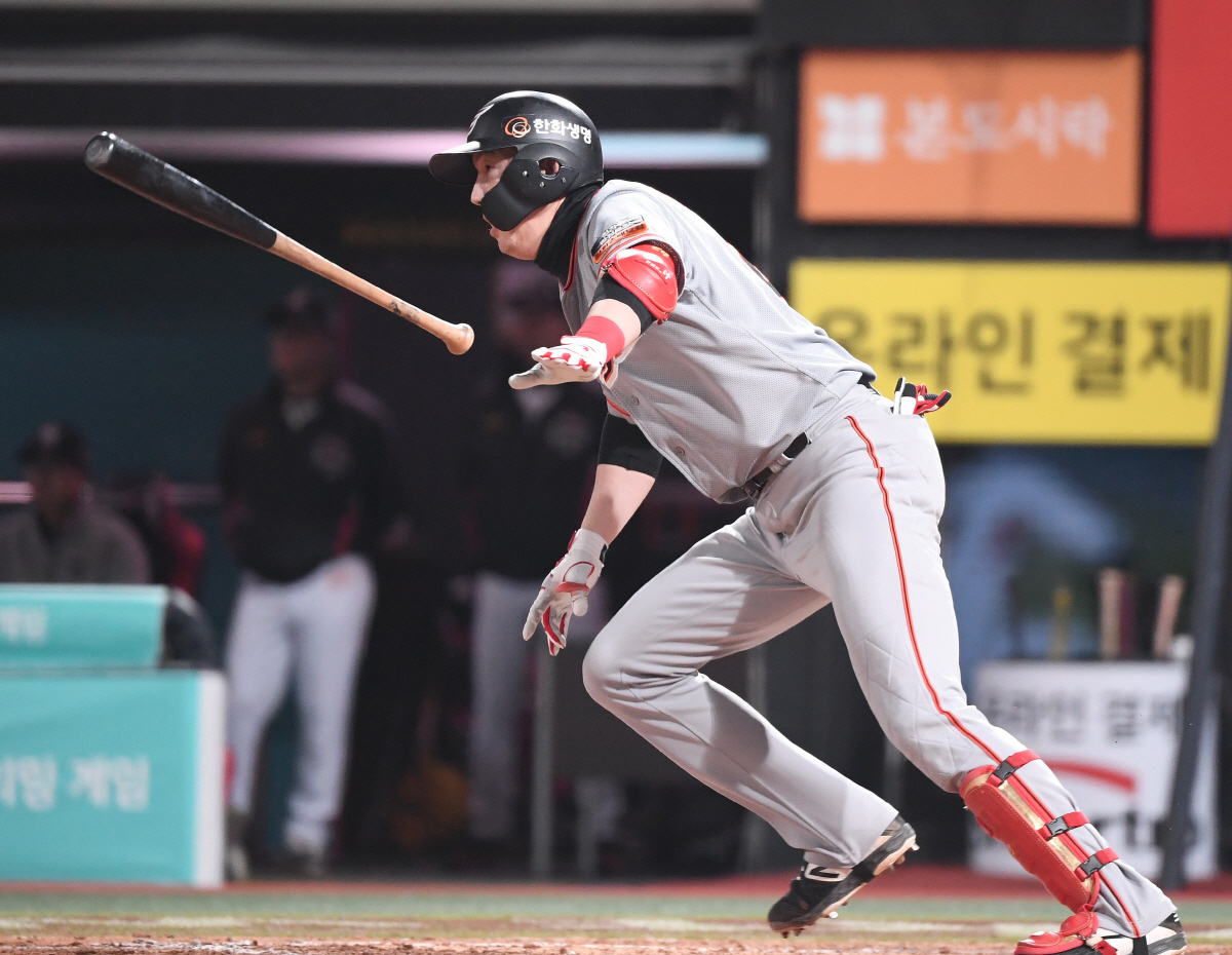 한화는 9회말에도 끝까지 추격을 끈을 놓치지 않았다. 선두 6번 노시환이 상대 마무리 정성곤을 상대로 중전안타를 치며 기회를 만들었다. 1사후 8번 김민하의 행운의 2루수 내야안타에 9번 오선진의 중전안타까지 터져 만루가 만들어졌다. 하지만 1번 정은원이 헛스윙 삼진으로 물러나 2사 만루. 한용덕 감독은 마지막 기회에서 대타 김회성을 올렸고 김회성은 초구를 좌측 담장 상단을 때렸고 그사이 3명의 주자가 모두 홈을 밟아 10대9가 됐다.