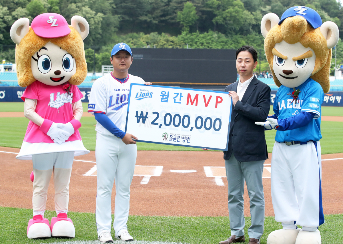 올곧은병원 우동화 병원장이 신세계상품권 200만원을 전달했다. 삼성 라이온즈 월간 MVP 시상식은 매달 진행될 예정이다.