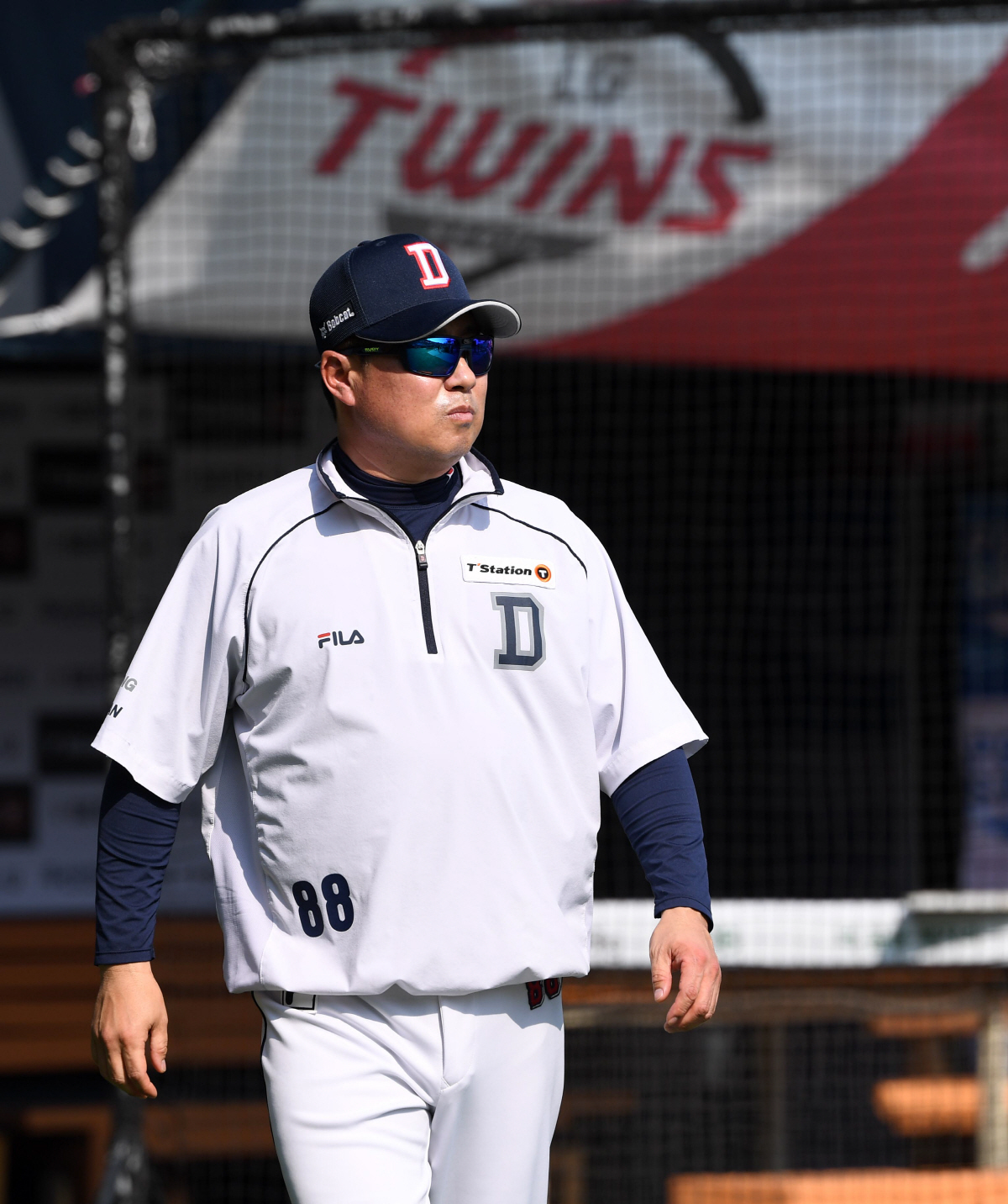 두산 베어스와 LG 트윈스의 2019 KBO 리그의 주말 3연전 경기가 3일 잠실구장에서 예정된 가운데 양팀 선수단이 훈련을 펼쳤다. 두산 김태형 감독이 훈련을 지켜보고 있다. 잠실=허상욱 기자 wook@sportschosun.com/2019.05.03/